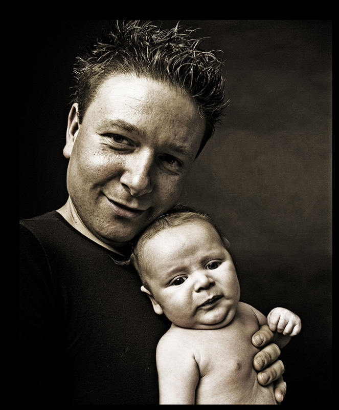 Obróbka kojarzy mi się z HDRem, oczy ojca w cieniu, całość w klimacie dość ponurym, ta ponura tonacja nie koresponduje z uśmiechem ojca. Dziecko przygwożdżone i chyba niezadowolone. Czy ojciec okazuje miłość czy raczej prezentuje trochę na siłę dziecko? Gdyby patrzył z czułością na dziecko delikatnie je trzymając można by mówić o uczuciach ojcowskich.