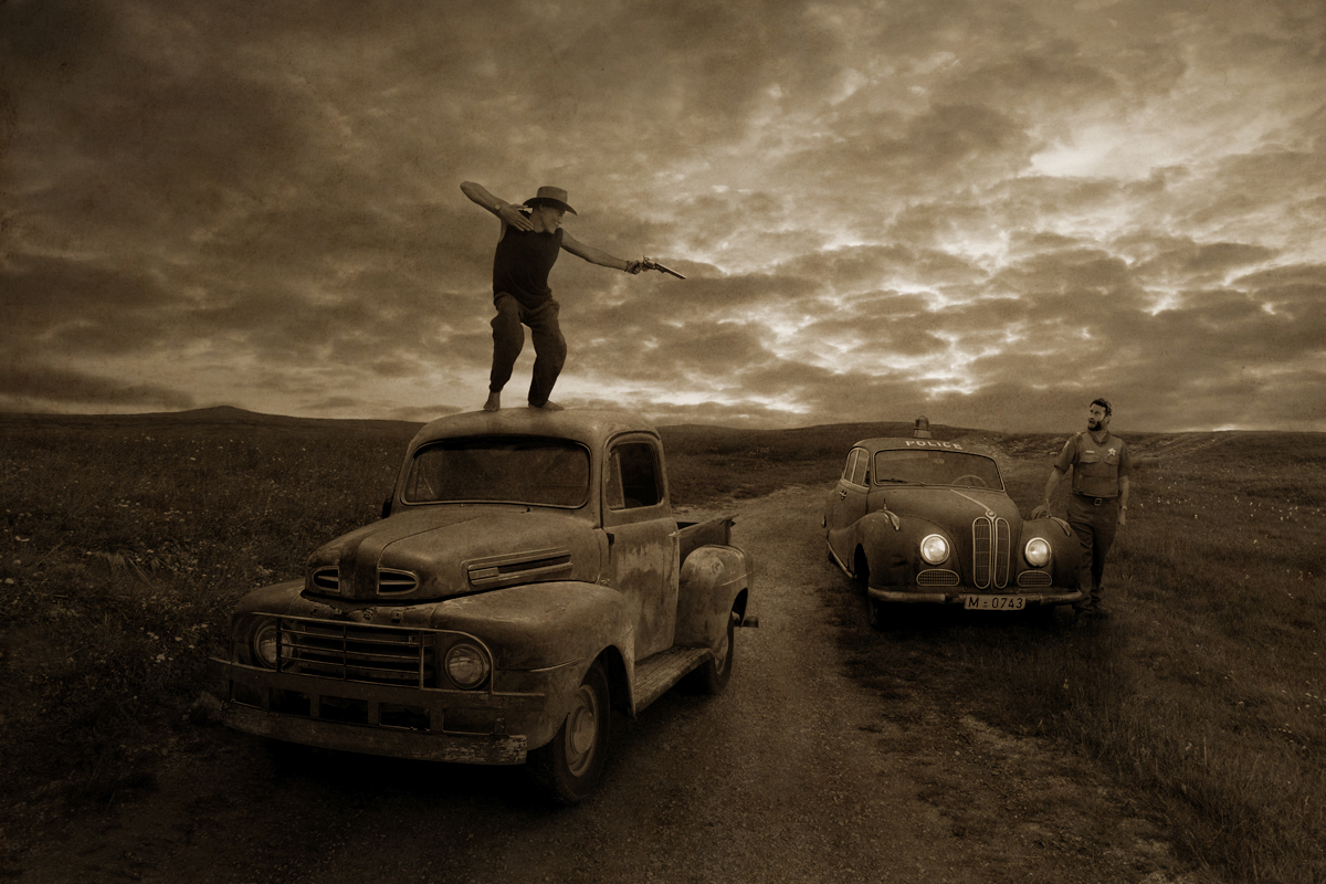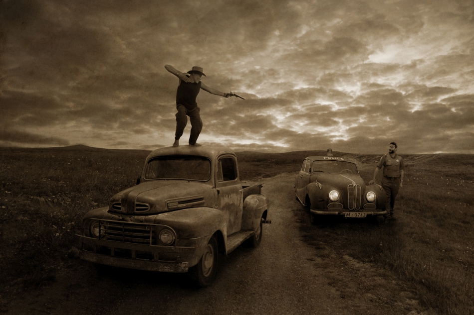 Nieco teatralne (zwłaszcza postać na samochodzie), jednak klimat Dzikiego Zachodu jest, a woń bezprawia unosi się w powietrzu ;)