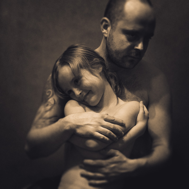 mała lekko zawstydzona i ucieka wzrokiem w bok (do mamy która towarzyszy? - to moje skojarzenie), mężczyzna wykazuje pewien dystans ale i męską stanowczośc, także ucieka wzrokiem od ....obiektywu i widza? robi sie....niebezpiecznie... autor panuje nad warsztatemn fotograficznym, głębia ostrości, światło z góry (w konsekwencji białe nosy i ciemne oczodoły) to ... teatralizacja, stylizacja na: piwnicę ? lochy? więzienie...? (blaszana lapma z gołą żarówką ... brrrr .. znowu robi się niebezpiecznie - czy to miejsce dla małej dziewczynki?) nagośc dziecka, półnagośc mężczyzny, tatuaż, piwnicznośc, uciekanie wzrokiem przed widzem, uciekanie do kogos bliskiego, przeciwko temu - nieco ciepła brunatna sceneria, miekkosc, delikatnośc ... prowokacja plątanie sie pomiędzy miłościa a....( i tu pora na użycie tego słowa) pedofilią, czy teatralizacja i wyłapanie mocnych emocji - czy to nie jest dokładnie to czego szukają pedofile? jesli to ma byc sztuka - co więcej oferuje? prowokuje, balansuje na krawędzi ...ciągle za mało, nie chciałbym tego zdjęcia w moim domu na ścianie |