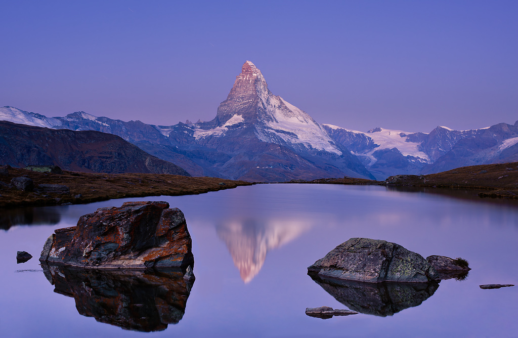 iceflower - Pierwszy dotyk. Szwajcaria - Zermatt (kanton Valais). Lake Stellisee (2540 m.n.p.m.) - widok na Matterhorn (4478 m.n.p.m) i pierwsze promienie słońca. Matterhorn jest szóstym pod względem wysokości samodzielnym szczytem alpejskim.. Zdjęcie 47048
