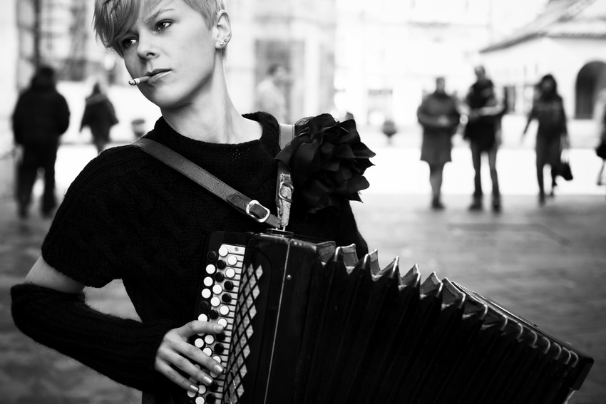 Ciekawa uliczna fotografia, sceneria drugiego planu wraz z bohaterką tworzą ciekawy konglomerat,