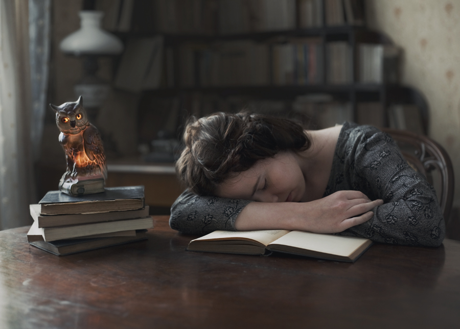 Zdecydowanie bez sowy. Tak się zastanawiam jak wyglądałoby to zdjęcie delikatnie przesunięte w prawo żeby nie było widać okna, z lekkim nieładem w książkach na stole i delikatny światłem dawanym przez lampę stojącą z tyłu. Byłem na tak