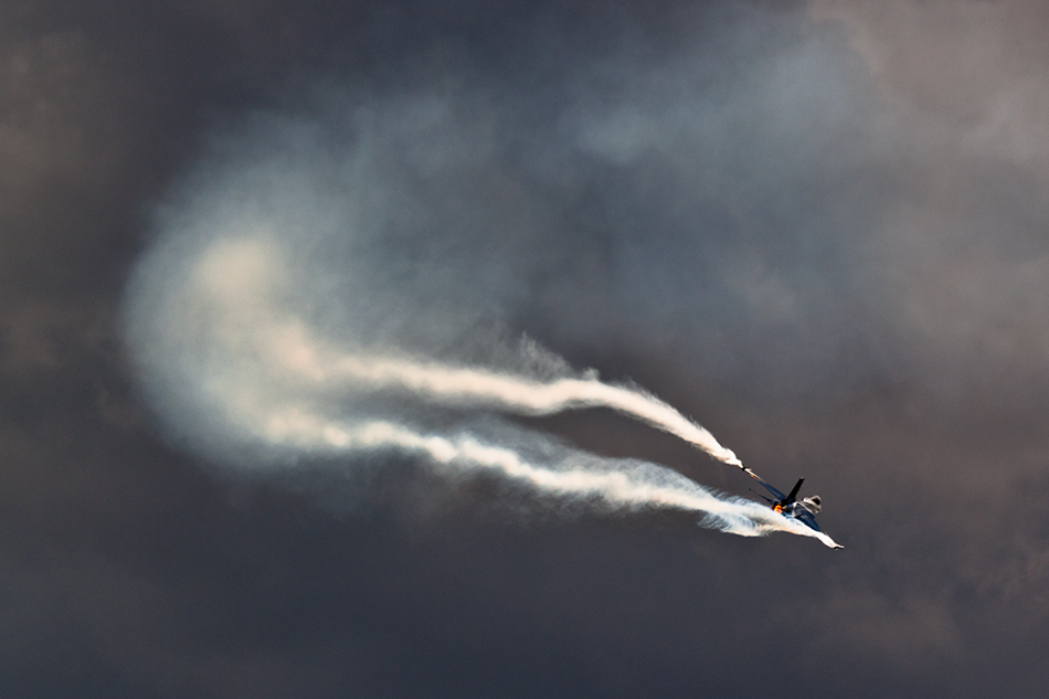 Oryginalnie. Ciemne, fakturalnie marmurowe tło doskonale służy ekspozycji smug i dodaje swoistego dramatyzmu w odbiorze. Dobrze ułożone w kadrze. Pozostawiłbym bez zmian. Publikuj.