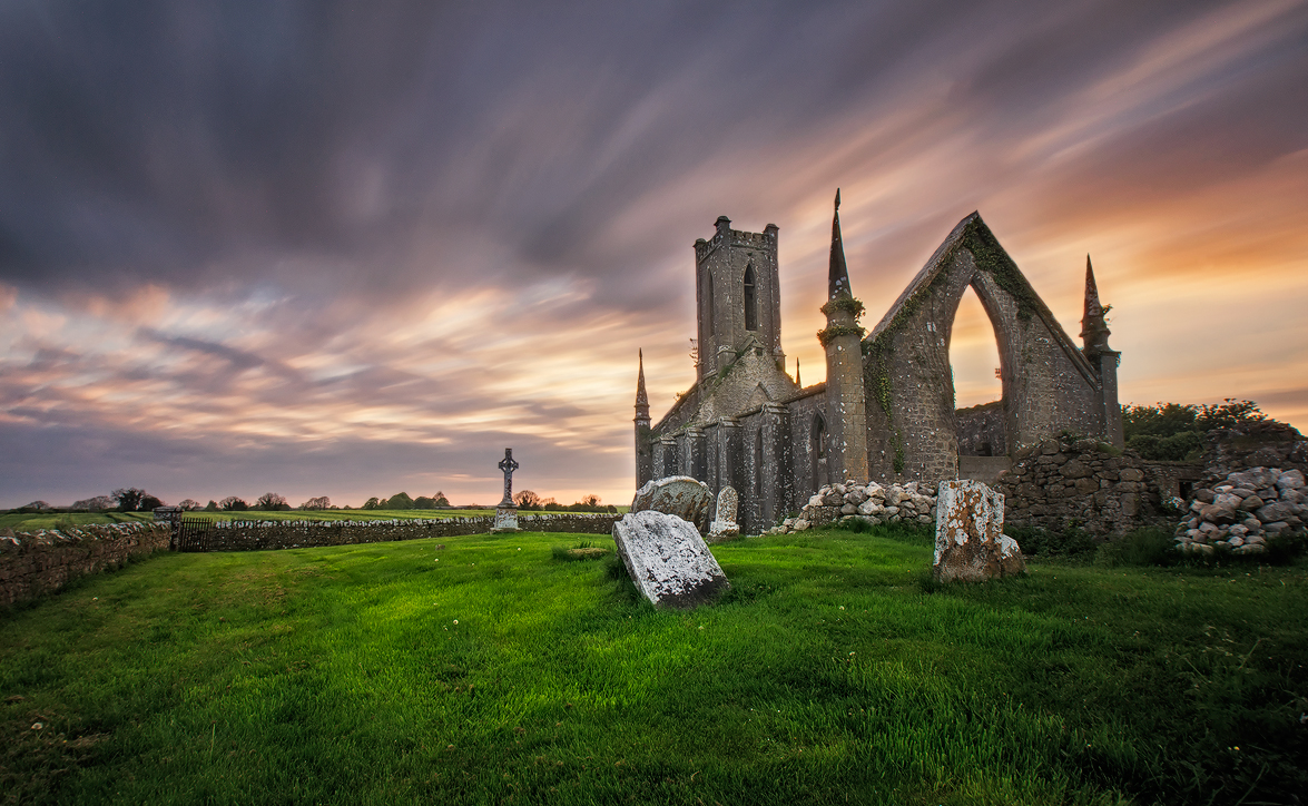 Nie ma powodu, dla którego kościół powinien się chylić. Ani ze względu na charakter kadru, ani w służbie tematu. Wieża kościoła powinna trzymać pion, czyli trwać dumnie mino popadania w ruinę. Ponieważ na lewo od ruiny jest krzyż, nie obracałbym kadru, tylko skorygował trochę perspektywę w pionie, czyli względem osi poziomej kadru.