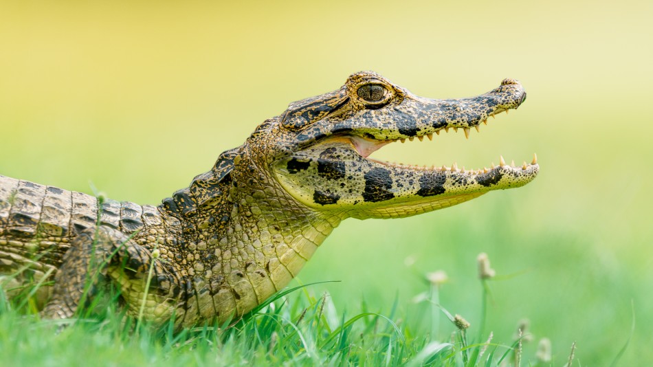 Ten “uśmiechnięty” młody kajman wypoczywał na brzegu sadzawki, która znajdowała się w centrum ośrodka dla turystów odwiedzających Pantanal. Jego otwarty pysk to nie uśmeich - to typowa metoda chłodzenia organizmu.